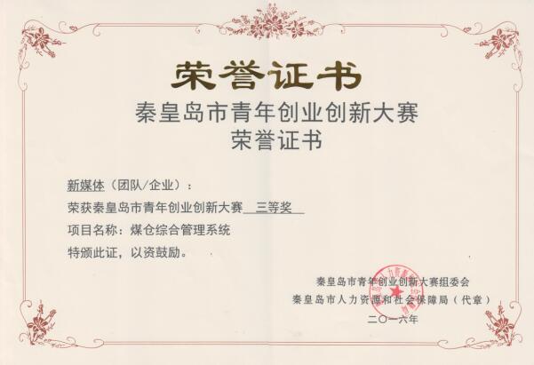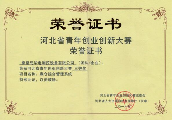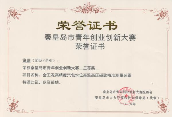2016年5月,公司組建了“銳磁”和“新媒體”兩個團隊,參加秦皇島市青年創業創新大賽,其中“銳磁”團隊的參賽項目為《全工況高精度汽包水位高溫高壓磁致精準測量裝置》,“新媒體”團隊的參賽項目為《煤倉綜合管理系統》,經過兩個團隊的不斷開拓創新,兩個項目先后在市級、省級及國家級的比賽中連獲殊榮。《全工況高精度汽包水位高溫高壓磁致精準測量裝置》獲得秦皇島市青年創業創新大賽三等獎,第二屆“中國創翼”青年創業創新大賽高端設備制造類項“金翼獎”;《煤倉綜合管理系統》獲得秦皇島市青年創業創新大賽三等獎,河北省青年創業創新大賽三等獎,第二屆“中國創翼”青年創業創新大賽高端設備制造類項“銀翼獎”。