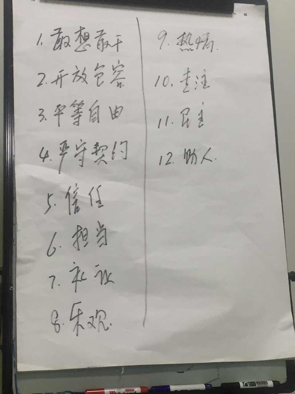 沙龍上,王老師從:敢想敢干,開(kāi)放包容,平等自由,嚴(yán)守契約,信任,擔(dān)當(dāng),禮讓,樂(lè)觀,熱情,專注,民主,助人等方面與大家展開(kāi)了討論和分享,輕松幽默的風(fēng)格,深入淺出的分析,深度與廣度并存的分享,讓大家沉醉其中。