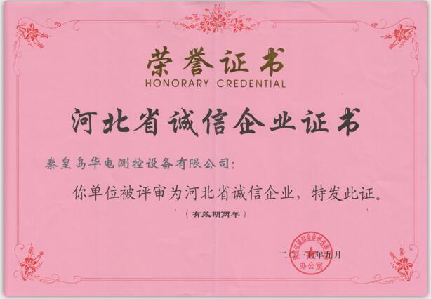 秦皇島華電測控設備有限公司被評為“河北省誠信企業”;
