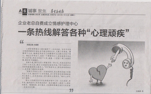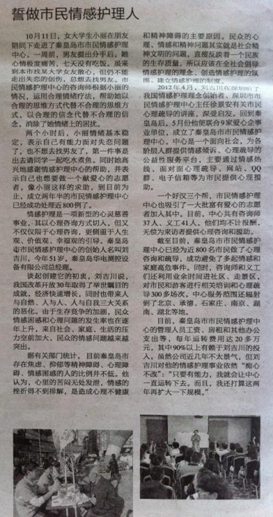 摘自《秦皇島晚報》(2014年10月15日,B15版):情感護理是一項新型的心靈慈善事業,其以心理咨詢方式切入,但又不僅僅限于心理咨詢,更側重于人生觀、價值觀、幸福觀的引導。秦皇島市市民情感護理中心的創始人名叫劉吉川,今年51歲,秦皇島華電測控設備有限公司總經理。