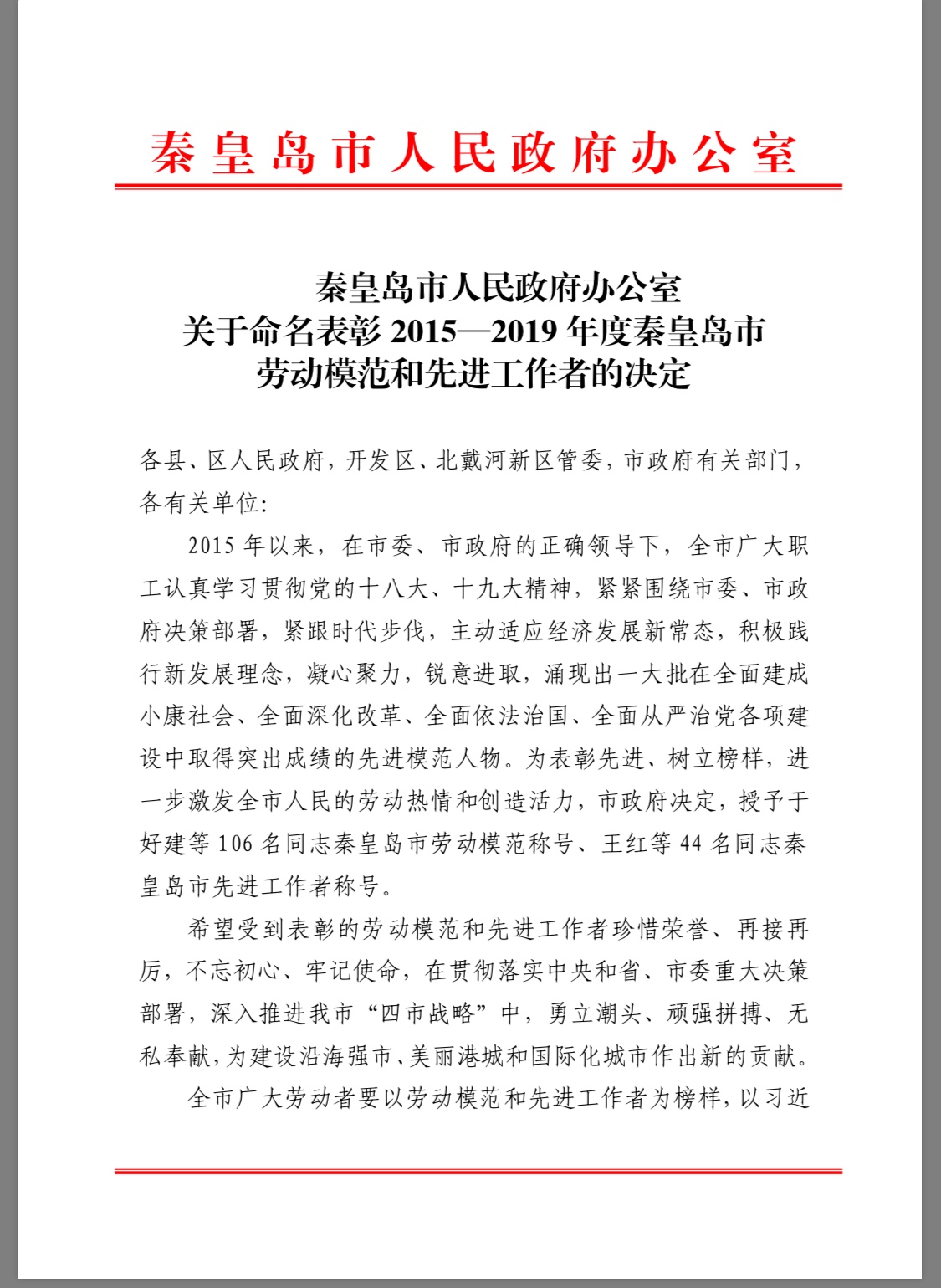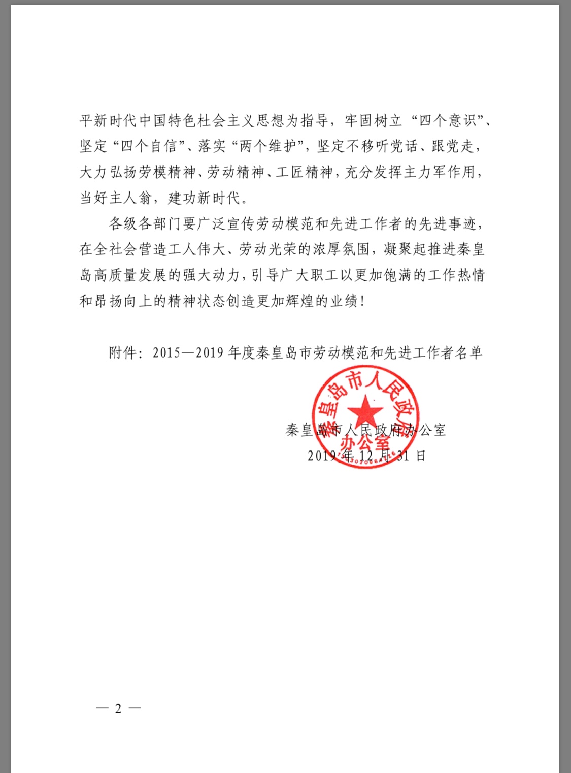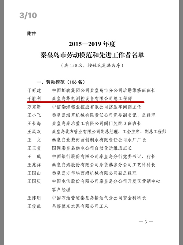 秦皇島市人民政府辦公室于2020年 1月3日向我公司下發《關于命名表彰2015-2019年度秦皇島市勞動模范和先進工作者的決定》,公司總工程師于勝利被評為秦皇島市勞動模范。