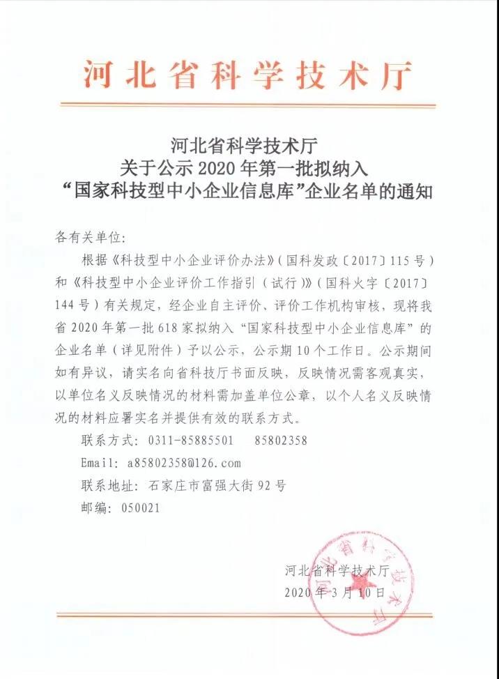 近日,河北省科技廳根據《科技型中小企業評價辦法》(國科發政【2017115號)、《科技型中小企業評價辦法工作指引(試行)》(國科火字【2017144號)要求,公示通過河北省2020年第一批“科技型中小企業”名單。我公司憑借在企業科技創新領域的成就成功入選,入庫登記編號:202013030209000247