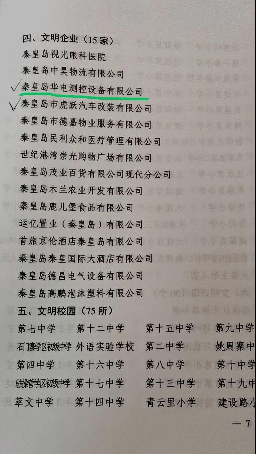 2020年4月,中共秦皇島市海港區委、區政府組織申報2019年度文明單位和文明個人,經過推薦評審,近日獲悉華電測控榮獲文明單位稱號。
