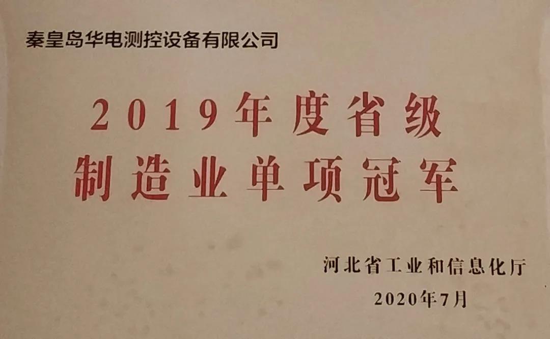近日,秦皇島華電測控設備有限公司獲得了由河北省工業和信息化廳評選的“制造業單項冠軍”并頒發了榮譽證書。