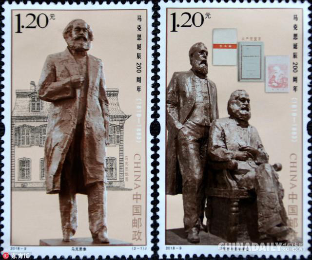 該套郵票設計者為中國美術館館長、中國美術家協會副主席吳為山,作為中國著名雕塑家,其雕塑代表作有《孔子》、《孔子問道于老子》、《齊白石與達芬奇對話》等。該套郵票選取吳為山為紀念馬克思而創作的兩尊經典雕塑作品。第一枚“馬克思像”,面值1.20元。主圖是馬克思立身雕像,背景畫面為馬克思位于德國特里爾市的故居。這里還有一個特殊的故事。吳為山雕塑的這尊高5.5米的馬克思銅像是中國政府為了表達中國人民對這位偉人的懷念與尊敬之情,在馬克思誕辰200周年之際,特意贈送給馬克思的故鄉―德國萊法州特里爾市而受邀創作的。2016年年初,吳為山受中共中央宣傳部的派遣,去德國考察并著手創作馬克思雕像。2018年4月13日這尊馬克思雕像被送到特里爾市博物館廣場,并于5月5日馬克思誕辰紀念日正式揭幕。此前德國特里爾市政府就是否接受中國政府贈送的這尊馬克思雕像,在市民中展開了熱烈的討論,還豎立起一個木制樣品供市民觀賞,大致了解馬克思雕像會如何呈現。特里爾市議會經過幾個月的爭論,于2017年3月以42票贊成、7票反對的表決結果,決定接受中國贈送的這尊馬克思雕像。