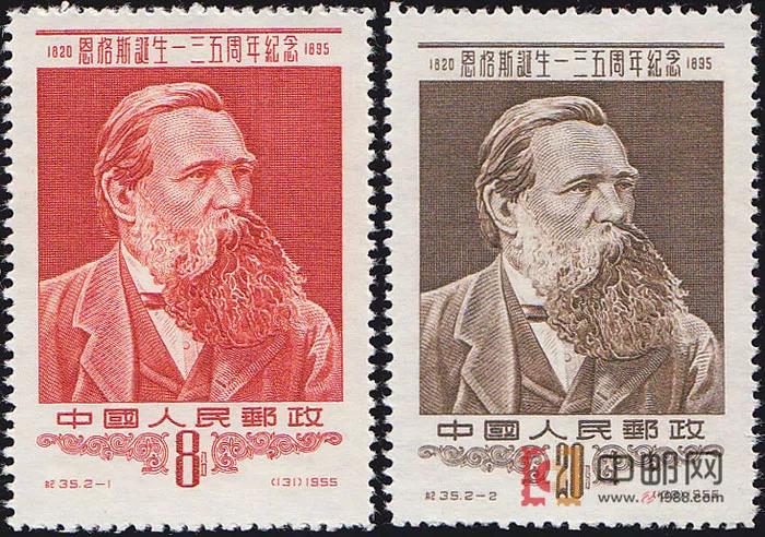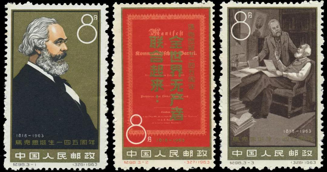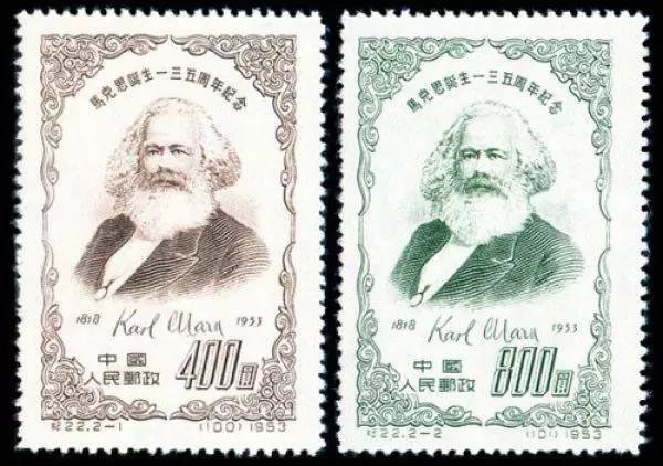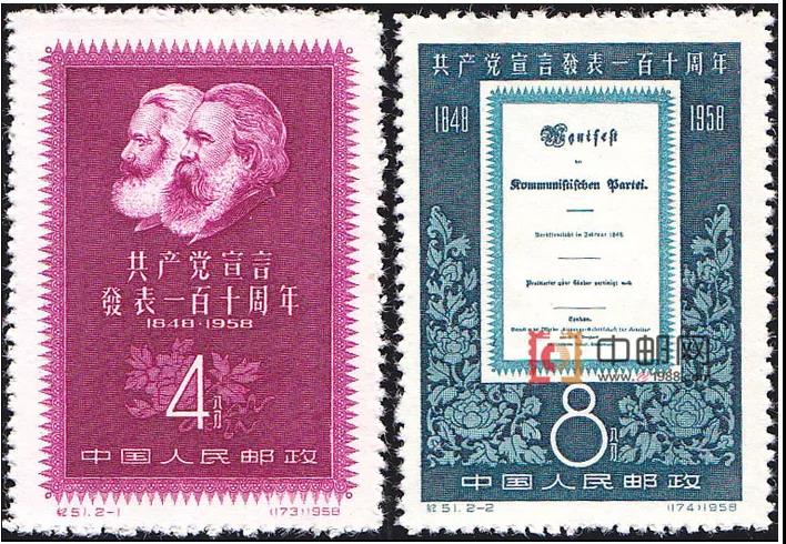 1958年7月1日,原郵電部發行紀51《共產黨宣言發表一百一十周年》紀念郵票,全套2枚,由孫傳哲設計,中國近代印刷公司雕刻版印刷。其中第一枚“馬克思和恩格斯像”,面值4分。圖案為充滿睿智、蓄著胡須的馬克思和恩格斯側面像。