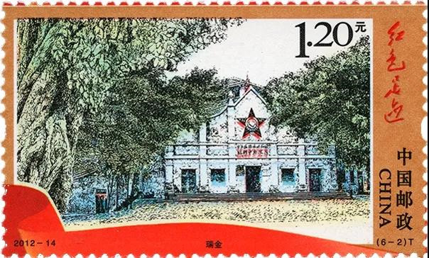 中國郵政2012年6月30日發行的《紅色足跡》特種郵票共由六枚郵票組成,分別是井岡山、瑞金、遵義、會寧、延安、西柏坡六處老革命根據地的圖案,面值全部是1.20元,其中的(6-2)T 瑞金,面值 1.2元,1253.08萬枚。郵票名《紅色足跡》四個字是設計者閻炳武先生采集毛主席的歷來所書寫的字樣拼組而成。設計者是巧妙的運用了這種鋼筆淡彩的手法,將每一處根據地完美的展現,無論是從設計、題材、形式方面來看,這都是一套有價值的郵票,所以收藏者一直對它的熱度沒有減少。