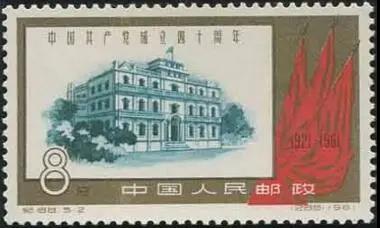 作為“南昌起義”總指揮部的“八一南昌起義大樓”是一座灰色磚混結(jié)構(gòu)建筑,它坐落在南昌中山路和勝利路交叉處的洗馬池,原名“江西大旅社”,現(xiàn)已改建為“八一南昌起義紀(jì)念館”。這座建筑曾多次登上郵票。其中發(fā)行于1961年7月1日的“紀(jì)88 5-2”,即《中國(guó)共產(chǎn)黨成立四十周年》郵票中的第二枚,面值8分,畫面圖案以金色作邊框,具有鮮明的時(shí)代特征。