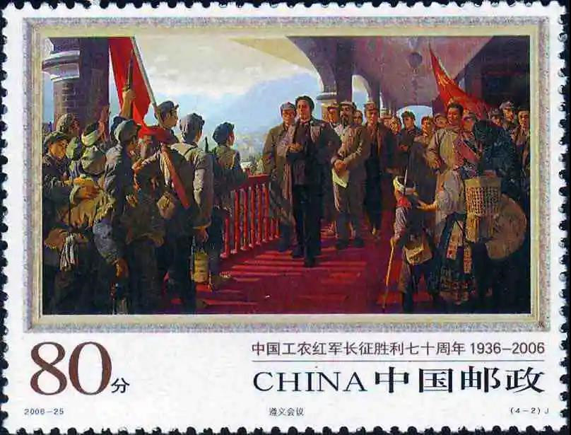 遵義會議作為紅軍長征途中的重要會議,也曾出現在2006年10月22日發行的《中國工農紅軍長征勝利七十周年》的紀念郵票1套4枚中。志號:2006-25,設計者:郝旭東。畫作者:靳尚誼(4-1)、彭 彬(4-2)、劉國樞(4-3)、張文源(4-4)、李寶林周順愷(小型張)。