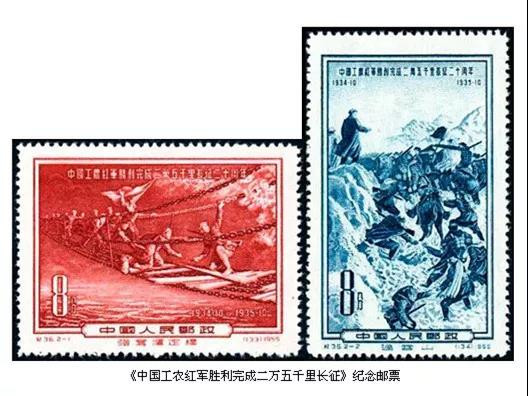 新中國成立以來,從1955年至2016年,我國郵政部門先后發行了多套反映長征題材的郵票。其中的第一套“長征”題材郵票,是1955年12月30日發行的J36《中國工農紅軍勝利完成二萬五千里長征二十周年》紀念郵票,由北京人民印刷廠營業分廠采用雕刻版印刷,一套兩枚,一橫一豎。橫票是強奪瀘定橋。畫面上瀘定橋下浪高水急,紅軍勇士踩著鐵索冒著炮火奮勇前進;豎票是過雪山。畫面上毛澤東和紅軍戰士正在翻越大雪山。該套郵票展示了紅軍長征的偉大、悲壯和艱苦。