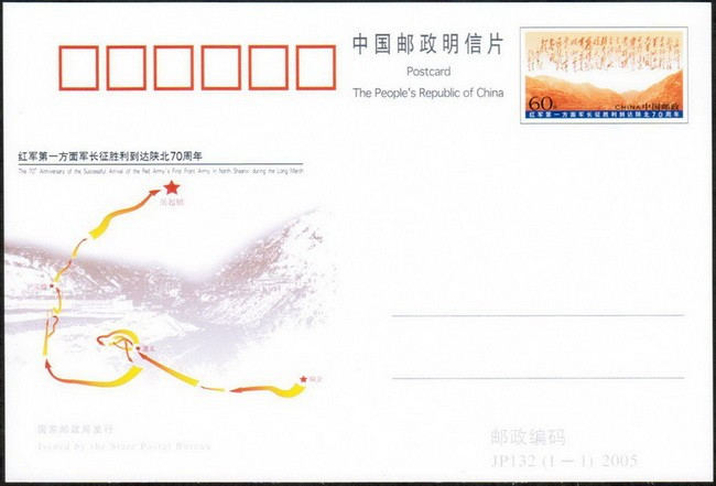 2005年10月19日,在紅一方面軍到達陜北吳起鎮70周年紀念日到來之際,國家郵政局曾發行JP132《紅軍第一方面軍長征勝利到達陜北70周年》紀念郵資明信片1套1枚,郵資片的郵資圖案為毛澤東的《七律?長征》詩,郵資片主圖為紅一方面軍長征路線簡圖,路線圖起點是瑞金,終點為陜北吳起鎮。這枚紀念郵資明信片的發行,從側面證實了長征題材第一套郵票,紀念的是紅一方面軍勝利完成二萬五千里長征二十周年。