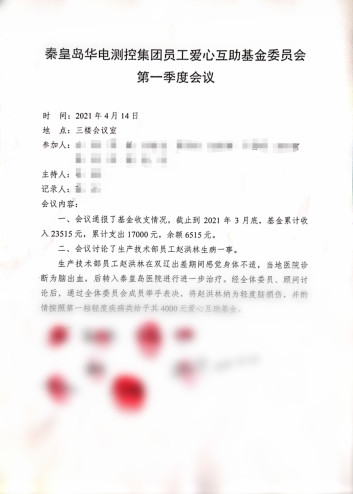 本次會議有兩項內容,首先由愛心互助基金委員會執行秘書張樂通報了基金收支情況。隨后由基金管理委員會主任李磊介紹了生產技術部員工趙洪林生病一事。生產技術部員工趙洪林在雙遼出差期間感覺身體不適,當地醫院診斷為腦出血,后轉入秦皇島醫院進行進一步治療。最后經全體委員、顧問討論后,通過全體委員會成員舉手表決,將趙洪林納為輕度腦損傷,并酌情按照第一檔輕度疾病類給予其 4000 元愛心互助基金。