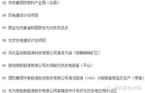 華潤電力有限公司華潤二期(唐山曹妃甸區)、 熱電聯產116 國網河北電力公司特高壓交流工程及南部電網500千伏、220千伏重大輸變電、國網冀北電力公司錫盟~山東特高壓交流工程(冀北段)及500千伏輸變電、香河飛馳高壓開關公司高壓輸變電設備(香河)、河北申科電子股份公司互感器、非晶微晶系列產品、智能JP柜、10KV智能開關(辛集)、保定四方三伊電氣公司智能電網裝備制造(保定高新區)、北方奧鈦納米技術公司新能源(武安)、國網新源控股有限公司豐寧抽水蓄能電站工程、國家電網公司風光儲二期擴建工程(張北)等。