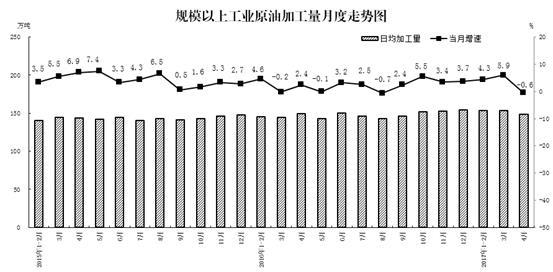 原油加工量下降。4月份,原油加工量4445.2萬噸,同比下降0.6%;日均加工量148.2萬噸,比3月份下降3.3%,這主要是受部分大型石化企業(yè)停產(chǎn)檢修影響。主要成品油生產(chǎn)也有所回落,其中,汽油產(chǎn)量同比下降4.0%,煤油產(chǎn)量增長(zhǎng)2.2%,柴油產(chǎn)量下降0.6%。1-4月份,原油加工量18251.0萬噸,同比增長(zhǎng)3.1%,比1-3月份回落1.4個(gè)百分點(diǎn)。