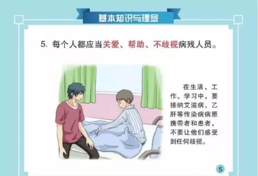 面對弱勢群體的病殘人員,人們是關愛、幫助?還是冷漠,甚至歧視?《中國公民健康素養—基本知識與技能》第一部分,關于基本知識和理念中的第五條,明確了“每個人都應當關愛、幫助、不歧視病殘人員”。