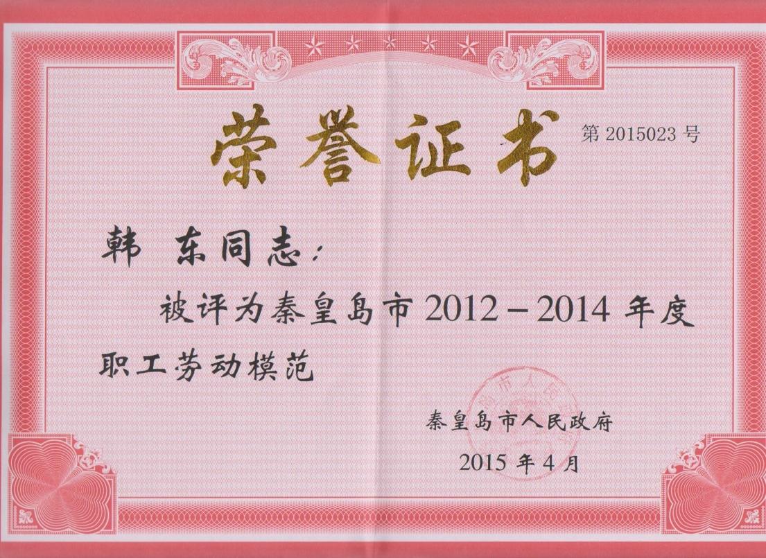 【企業要聞】熱烈慶祝我公司韓東被評為秦皇島市勞動模范