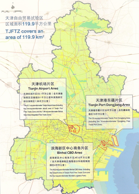天津自貿區2014年12月31日獲國務院正式批復,2015年4月21日正式掛牌,總面積119.9平方公里,是我國北方第一個自貿試驗區,也是繼上海成立自貿區以來,與福建、廣東同時獲批的第二批自由貿易試驗區之一。其產業定位涵蓋了面積30平方公里,以發展航運物流、國際貿易、融資租賃等現代服務業為主的天津港東疆片區;面積43.1平方公里,以發展高端制造業和與之配套的生產性服務業為主的天津機場片區;面積46.8平方公里,以發展金融創新為主的現代服務業濱海新區中心商務片區三個片區。