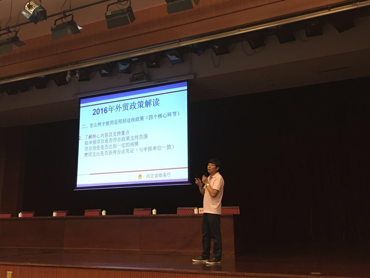 本次主題培訓在秦皇島大酒店舉辦。培訓的第一課是由省商務廳外貿處處長權奇衡解讀了國務院《關于促進外貿回穩(wěn)向好的若干意見》和省政府辦公廳《關于 2016年全省外貿攻堅行動方案的通知》,他詳細解讀了國務院和我省為了加快培育外貿競爭新優(yōu)勢的相關政策;接下來來自省貿促會展覽部的王曉曼部長講解了出國展覽及國際市場開拓,她詳細地為大家講解了出國展覽的相關注意事項以及如何利用展覽去開拓國際市場;隨后省國稅局進出口處副處長王翠蓮為我們解讀了出口退稅相關政策,介紹了退稅流程和相關最新退稅手續(xù);省外匯管理局經常項目處主任科員于慶榮講解了貨物貿易外匯管理業(yè)務;秦皇島海關稽查科科長王素素解讀了海關企業(yè)信用管理暫行辦法,同時中信保河北分公司處長助理孫東坡解讀了出口信保的相關政策;最后阿里巴巴秦皇島負責人賈東華為我們講述了“大數據讓中國外貿更美好”的課程,介紹了大數據時代的機遇與挑戰(zhàn)。