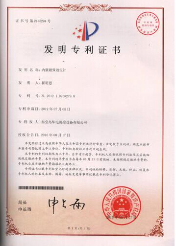 【企業要聞】喜訊:公司申請的“內裝磁致液位計”獲頒發明專利證書