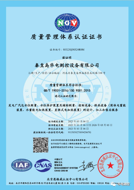 華電測控順利通過ISO9001質量管理體系再認證” 2023-03-072023年3月7日,秦皇島華電測控設備有限公司收到來自北京恩格威認證中心頒發的《質量管理體系認證證書》,這表明華電測控2023年ISO9001質量管理體系再認證順利通過!秦皇島華電測More