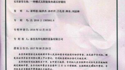 【企業要聞】“一種槽式太陽能集熱器反射鏡組”頒發專利證書” 2017-09-01公司于2016年12月16日提交的“一種槽式太陽能集熱器反射鏡組”(專利號:ZL201621383993.6)專利已被中華人民共和國國家知識產權局頒發專利證書。授權公告日為2017年08月29日,證書號第6420679號。 本實用新More